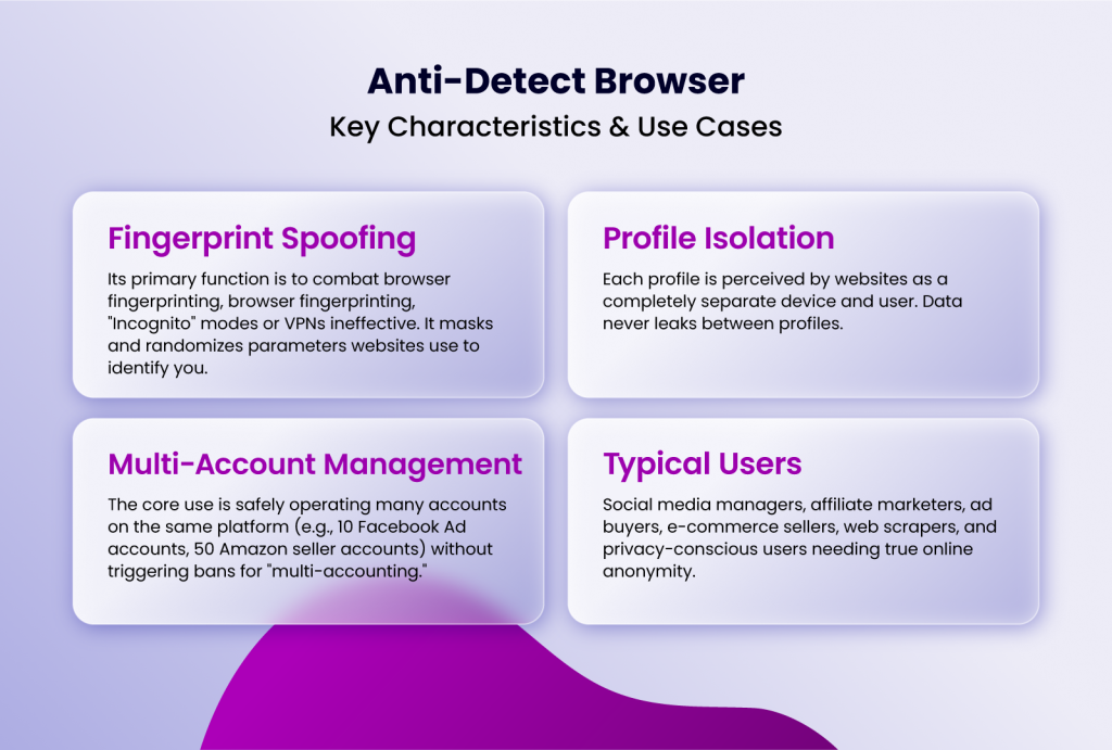 An anti-detect browser is a specialized software designed to create and manage multiple, fully isolated browser profiles. As defined in our knowledge hub, each profile has its own unique browser fingerprint (a combination of browser type, version, OS, screen resolution, fonts, etc.), separate cookies/local storage, and can be assigned a distinct IP address via proxy integration.
