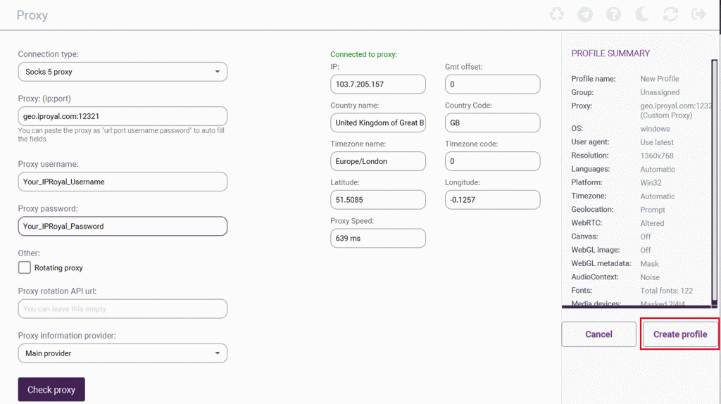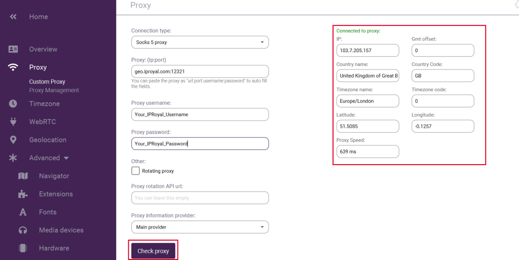 Step #6: Verify your proxy works by testing the IP location with the Check proxy button.