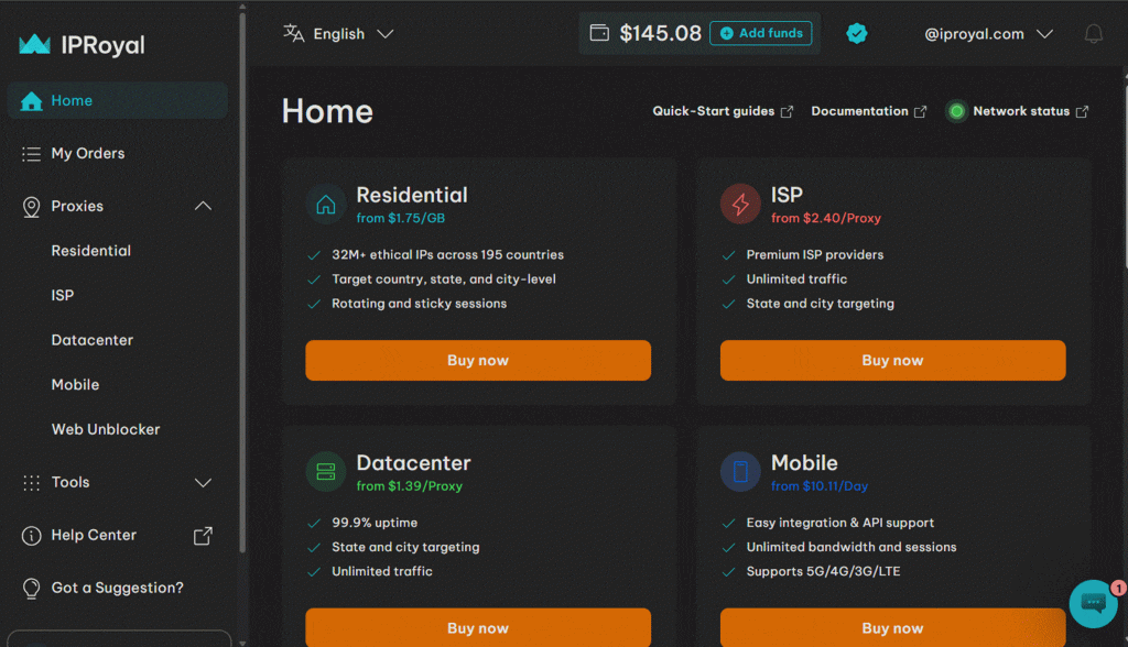 Since Incogniton doesn’t include dedicated proxies by itself, you need to pair it with reliable proxy servers. This is when IPRoyal comes in.