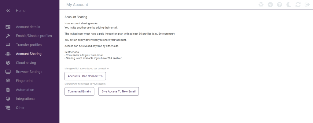 Easily share your account with other Incogniton users using the account sharing feature. The goal of this feature is to make it easier for one account to manage another account’s profiles. It’s more secure and convenient to directly log in to manage the profiles, without sharing passwords. Let’s see how it works!