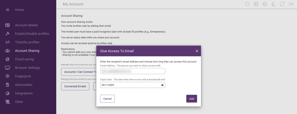 Step 1: Log in to the Incogniton app and navigate to My account – Account settings – Account sharing.