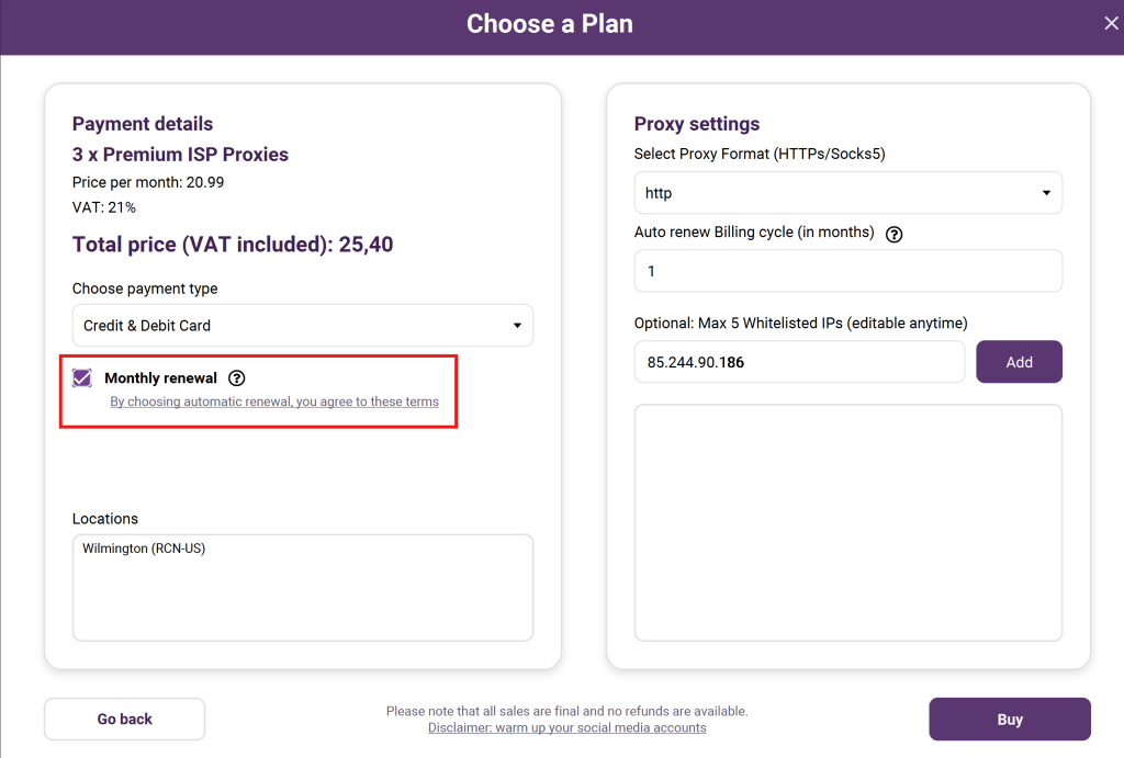 Note! It’s also possible to switch off the monthly renewal option while ordering the proxy in the shop. In the payment details section there’s a box with Monthly renewal. Deselect this option if you don’t want the proxy to be automatically renewed every month.