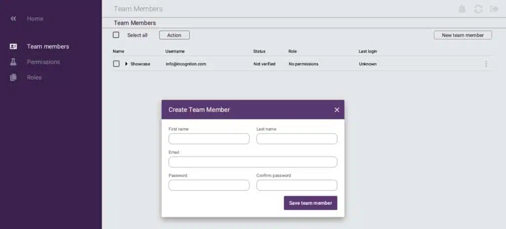 The first thing you need to do when you want to add someone as a team user is to create a user account for him / her. You can do this by hitting the button team management and go to the section ‘Team Members’. After that you need to hit the button ‘New team member’ and a box will pop up where you are able to fill in the details of the new team member of your Incogniton profiles.